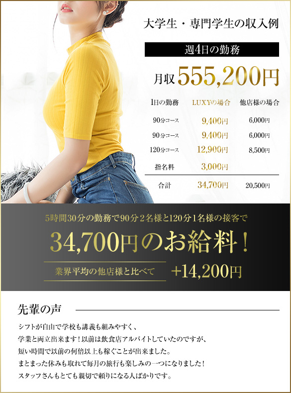 18歳~30歳までの20代がメインの店舗となりますので大学生・専門学生が多数在籍しております。皆さん学業と両立し高収入を得る事で素晴らしい学生生活を送っております。