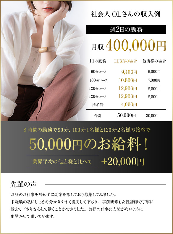 勤務時間にもよりますが6時間~8時間勤務で3万円前後~5万円、1日の最高ですと9万円稼ぐセラピストも在籍しております。