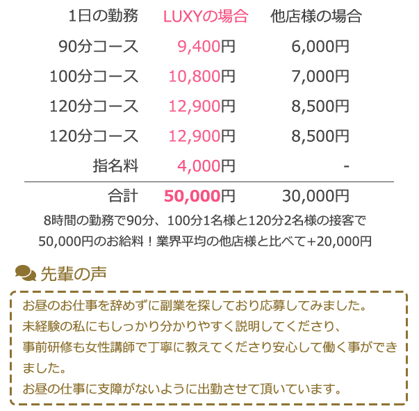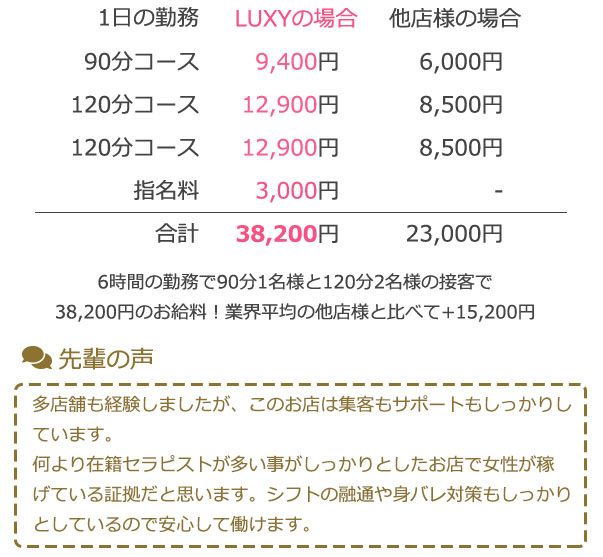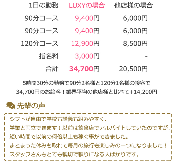 お給料について SALARYお給料について 完全日払い&安心の日給保証制度 業界最高水準のお給料が魅力のお店です。頑張り次第でお給料はどんどんあがっていきます。 平均お給料例 大学生・専門学生の収入例 週4日の勤務で月収 555,200円 子育てママさんの収入例 週3日の勤務で月収 458,400円 社会人OLさんの収入例 週2日の勤務で月収 400,000円 お給料について 先輩セラピストの声 当社のメリット デビューの流れ よくある質問 応募・ご相談